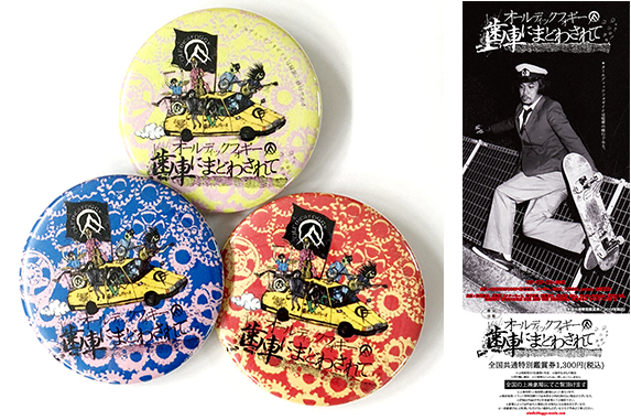 劇場窓口では黄色、ディスクユニオンでは赤色、バンドの物販、その他の販売店では青色の缶バッヂが特典となります。